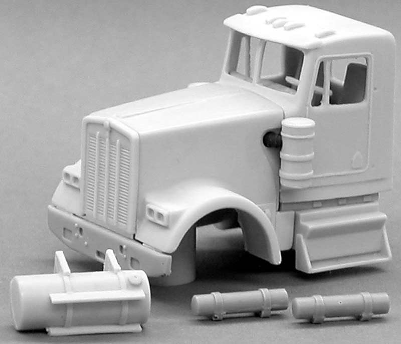 Cab........$20.00 All parts are resin cast unless noted. Resin castings do sometimes contain some small air bubbles. I have tried to keep these to a minimum. Resin may vary in color from time to time. All cast castings are made from my original patterns. Kits were designed for the more experienced modeler with some kit-bashing or scratch building experience. They are basic kits for converting 1/87 scale truck models into a Kenworth truck of your choosing and do not contain detail parts, tires or wheels. This is left up to the individual modeler. THEY ARE NOT INTENDED FOR CHILDREN. - Dennis Aust PLEASE INCLUDE CHECK OR MONEY ORDER WITH ORDER. SORRY NO C.O.D.s