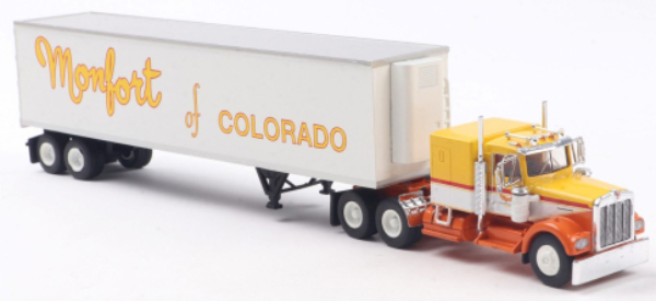 Brekina will soon be delivering their recently released Kenworth W900 truck tractor and 45' refrigerated trailer in two Monfort of Colorado schemes. Shown at top above is the original scheme and below it is the last scheme used before the company was acquired by Conagra in 1987. [updated 12/02/2025]