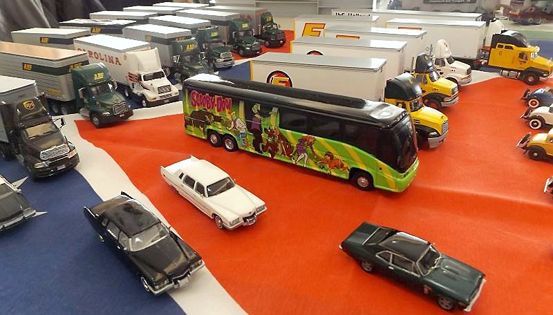 Christian Köhlen had this extensive display of ABF Freight and Estes Express Lines truck tractor and trailers on display at the 2015 Fulda Meet. The Mack CH613 is a detailed Herpa model, the Mack Visions are Masterbilt Models resin kits, and the Sterling truck tractors were built from Jacobs Models resin kits.
