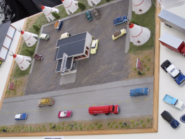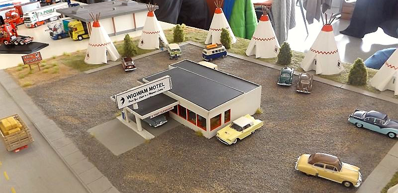 This beautiful Wigwam Motel diorama built by Uli Slovig was on display at the 2015 Fulda Meet. This appears to be a model of one of the remaining Wigwam Motels in Holbrook, Arizona. For more information on the real Wigwam Motels, check the Wikipedia entry.