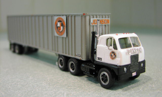 This Johnson Motor Lines tractor-trailer rig from Fred Gruin was built using a Sylvan Scale Model International Emeryville resin cab mounted on a Promotex frame with Boley wheels, A-Line mirrors, and Herpa air horns. It is hooked to a 40' Athearn Fruehauf trailer with Graphics on Demand decals on both units. Posted January 9, 2016 |