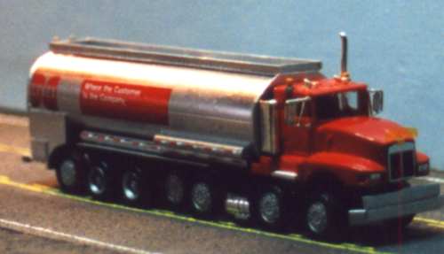 This heavy duty tank truck was modeled by Al Garrison. The scratchbuilt tank body is mounted on a Herpa Kenworth T600 chassis with an additional steer axle and three additional axles at the rear.
